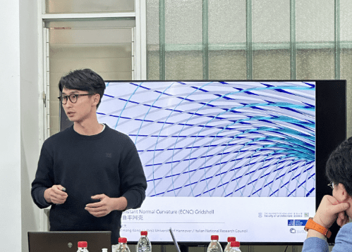 Haotian Man, the founder of Atelier Maneuver, presented at Kunming University of Science and Technology on the latest research outcome in Equilateral Constant Normal Curvature Gridshell.