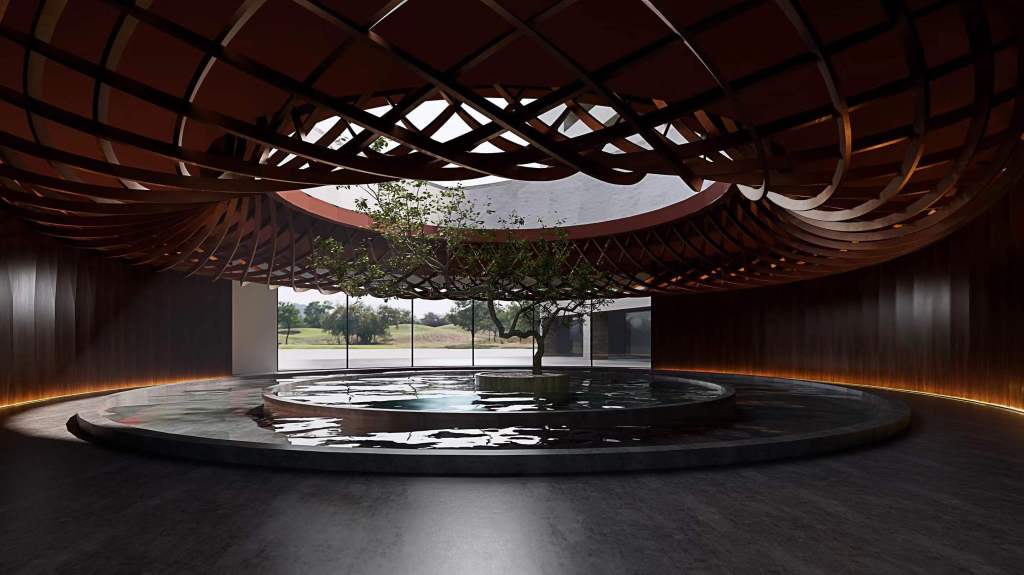 The spatial strategy embraces Chinese wellness philosophies while choreographing circulation through a central ritual atrium. This circular lobby space becomes a convergence point—symbolically and physically—redistributing access across hotel wings, spa zones, and hot spring clusters.