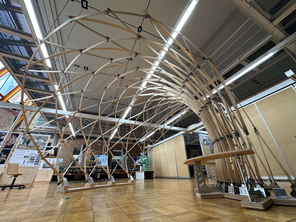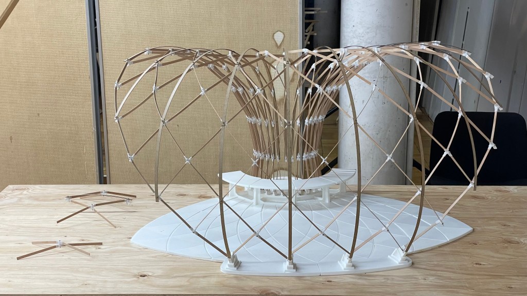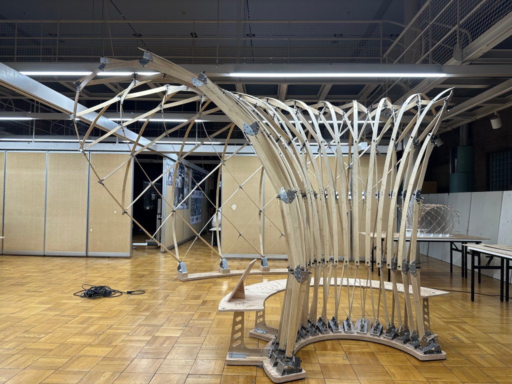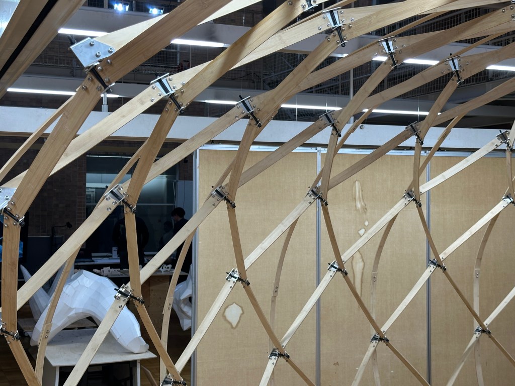 This system employed only one type of flat, straight member. Through a process of computational modeling and physical prototyping, the elements were designed to bend and twist along geodesic curvature, resulting in a complex surface with constant normal curvature—without the need for any custom or curved components.